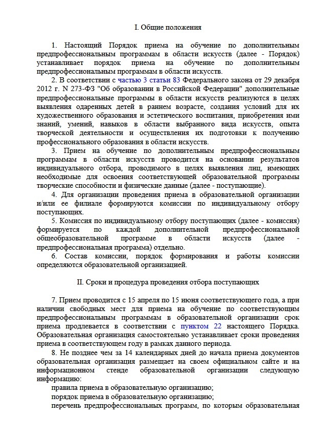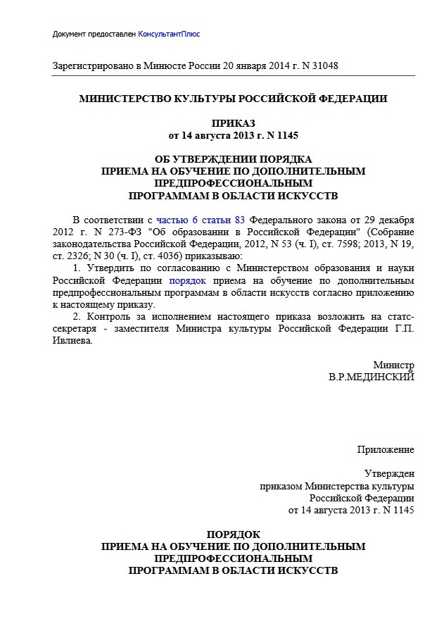 1. Приказ Минкультуры России от 14.08.2013 № 1145 "Об утверждении порядка приема на обучение по дополнительным предпрофессиональным программам в области искусств